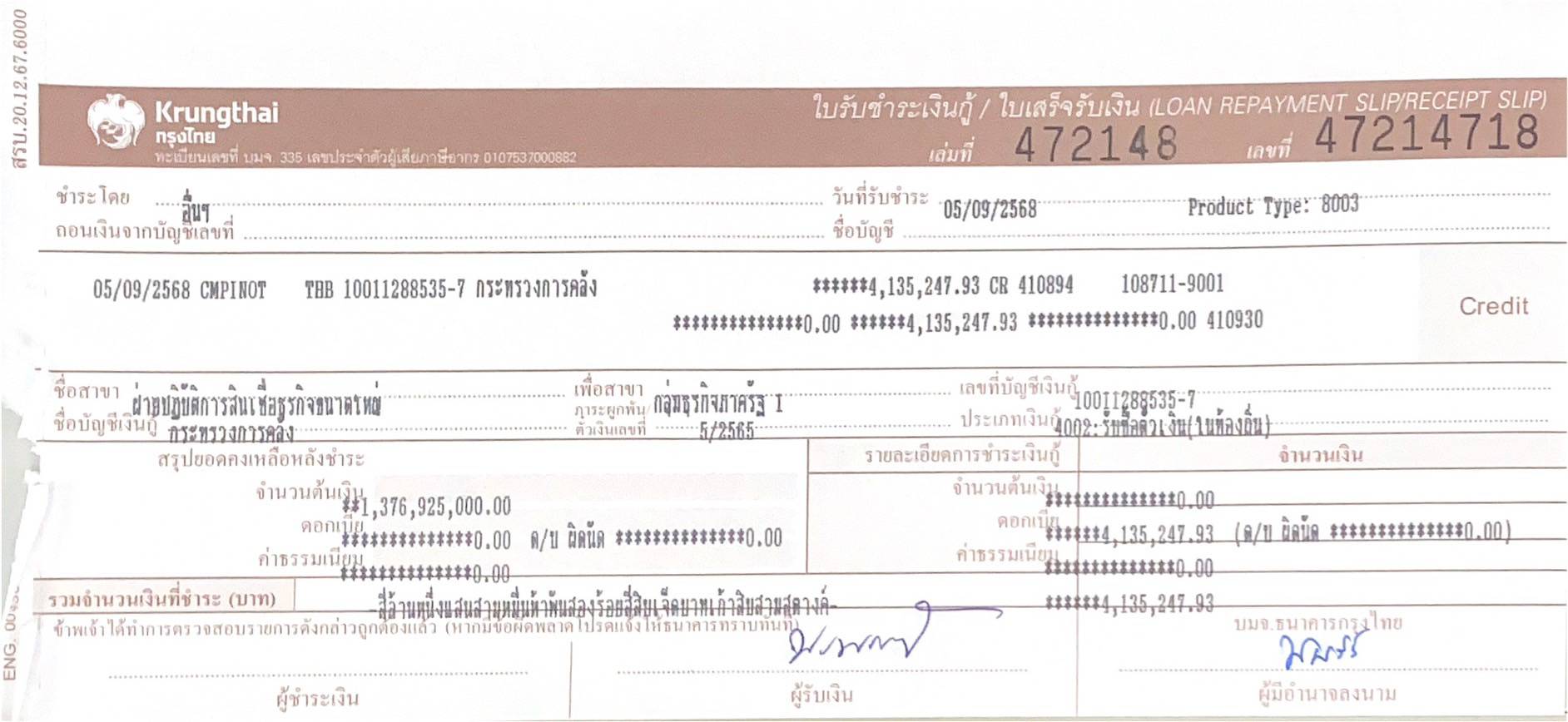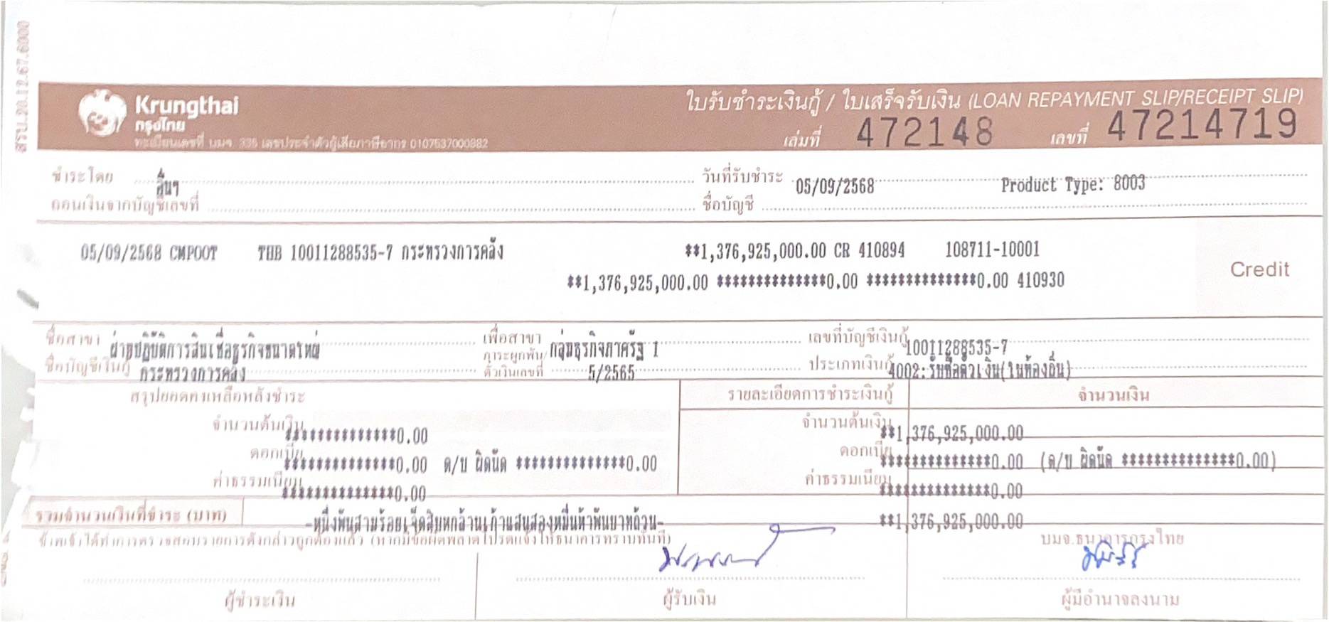 ธภร1. 2467 2568 Billing แจ้ง สบน.กรณี Prepayบางส่วน PN 18,000.0 ลบ. วันที่ 5.9.68.pdf Slip ชำระต้นเงินกู้ PN เลขที่ 5_2565 จำนวน 1,376.925 ลบ. (ชำระวันที่ 5-9-68).jpg Slip ชำระดอกเบี้ย PN เลขที่ 5_2565 วงเงินกู้ 1,376.925 ลบ. (ชำระวันที่ 5-9-68).jpg |
