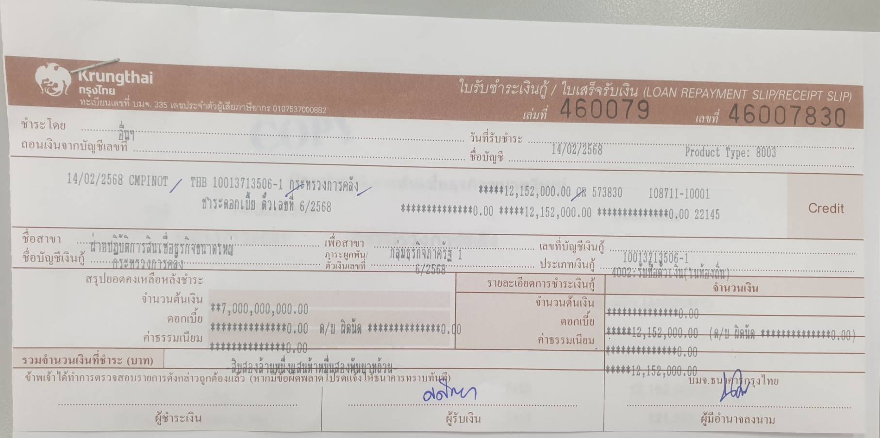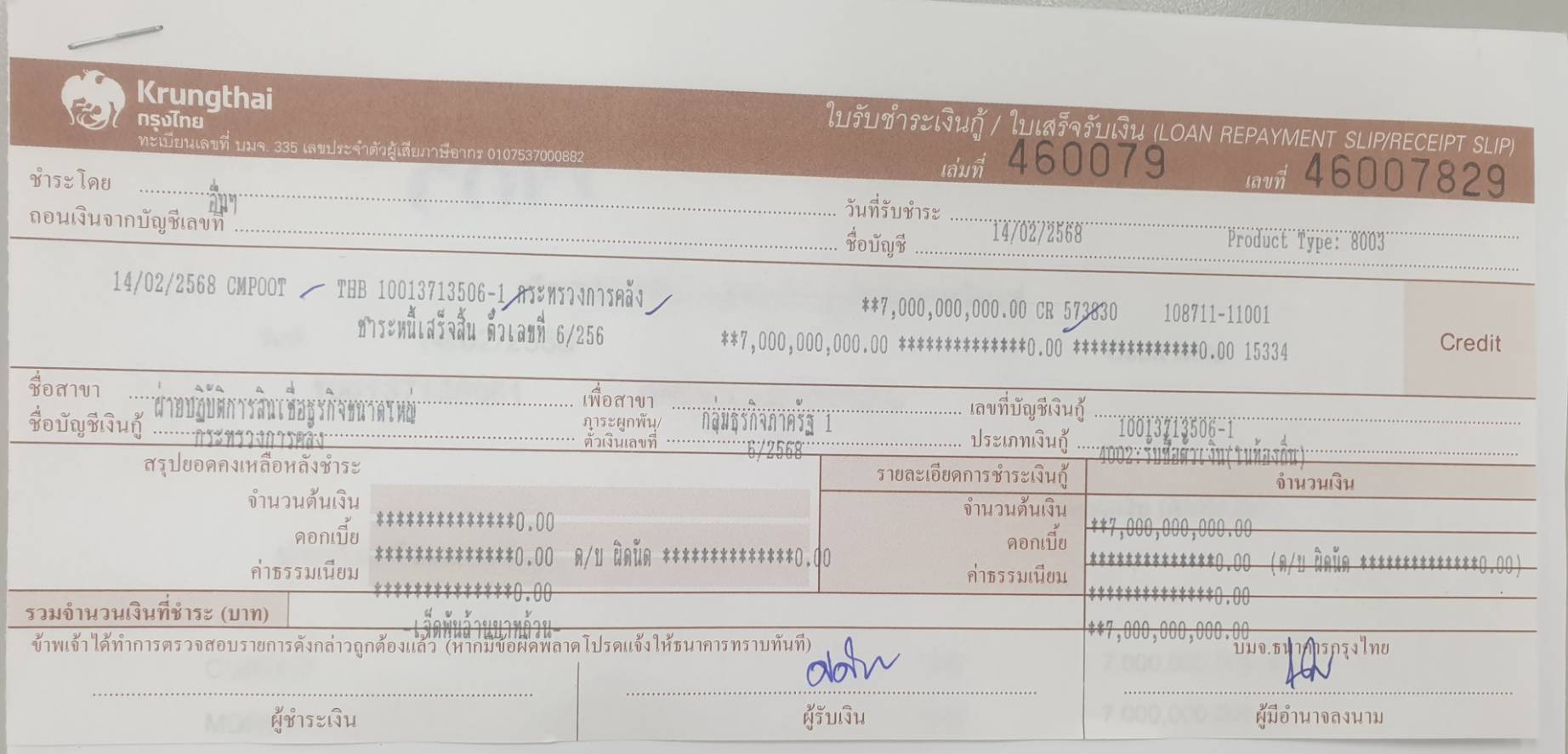 ธภร1. 457-2568 Billing แจ้ง สบน. Prepay .PN 27,000 ลบ. (ชำระวันที่ 14-2-68 ).pdf Slip ชำระต้นเงินกู้ PN เลขที่ 6_2568 วงเงิน7,000 ลบ. (3 _14-2-68).jpg Slip ชำระดอกเบี้ย PN เลขที่ 6_2568 วงเงิน 7,000 ลบ. (3 _14-2-68).jpg ตั๋วเลขที่ 6_2568 จำนวน 7,000 ล้านบาท.pdf |