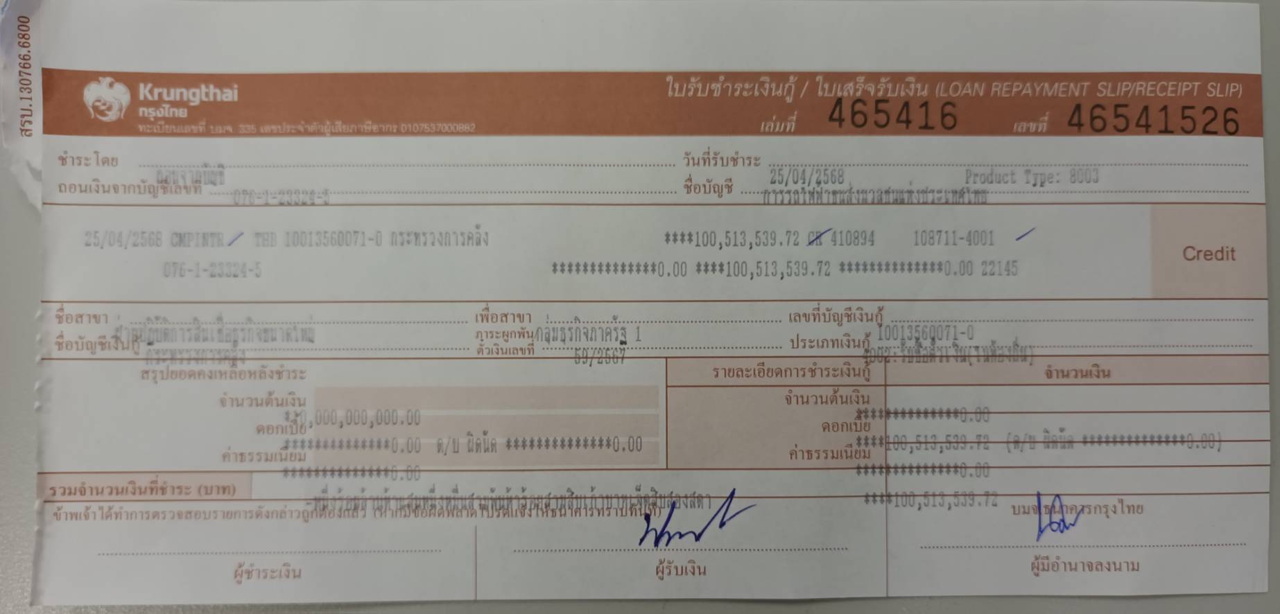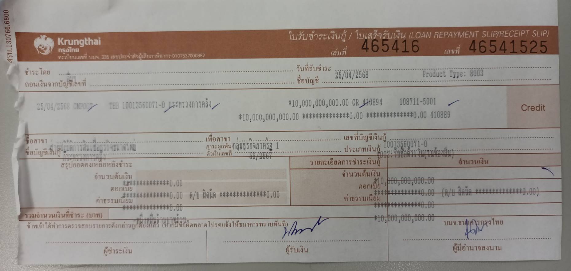 ธภร1. 1222-2568 Billing Prepay PN 10,000ลบ.(59-67) 25-4-68..pdf Slip ชำระต้นเงินกู้ PN วงเงิน 10,000 ลบ. (ปรับหนี้กู้ต่อ รฟม.สายสีส้ม 25-4-68).jpg Slip ชำระดอกเบี้ย PN วงเงิน 10,000 ลบ. (ปรับหนี้กู้ต่อ รฟม.สายสีส้ม 25-4-68).jpg ตั๋ว PN 59_2567 10,000 MB. (Prepay 25-4-68).pdf |