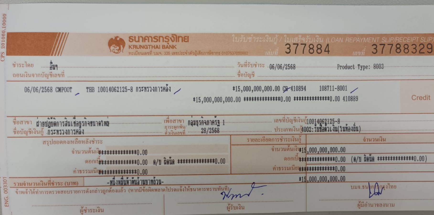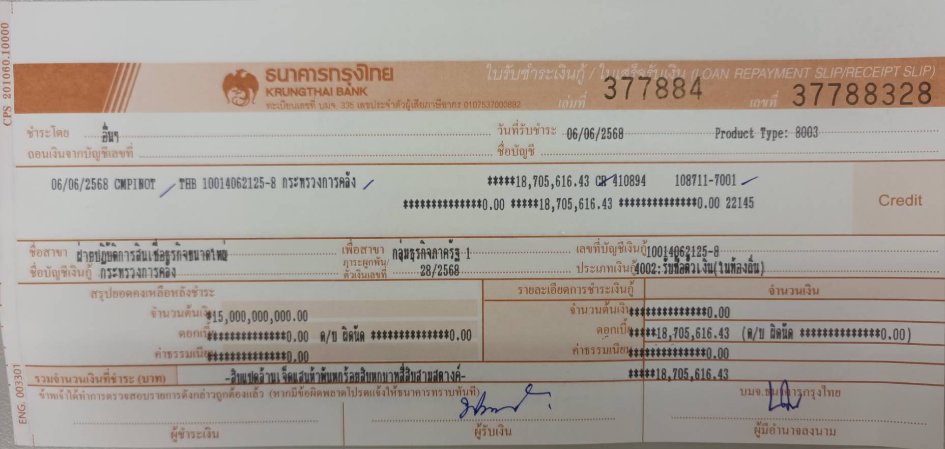 ธภร1. 1760-2568 Billing+สำเนา แจ้งสบน.Prepayบางส่วน PN 30,000 ลบ. 6-6-68 (สบน.).pdf Slip ชำระต้นเงินกู้ PN 15,000 ลบ. (6-6-68).jpg Slip ชำระดอกเบี้ยเงินกู้ PN 15,000 ลบ. (6-6-68).jpg ตั๋ว PN 28_2568 15,000 MB. (Prepay 6-6-68).pdf |