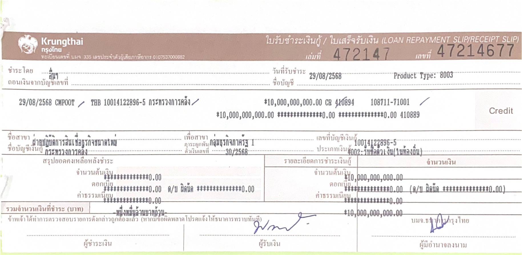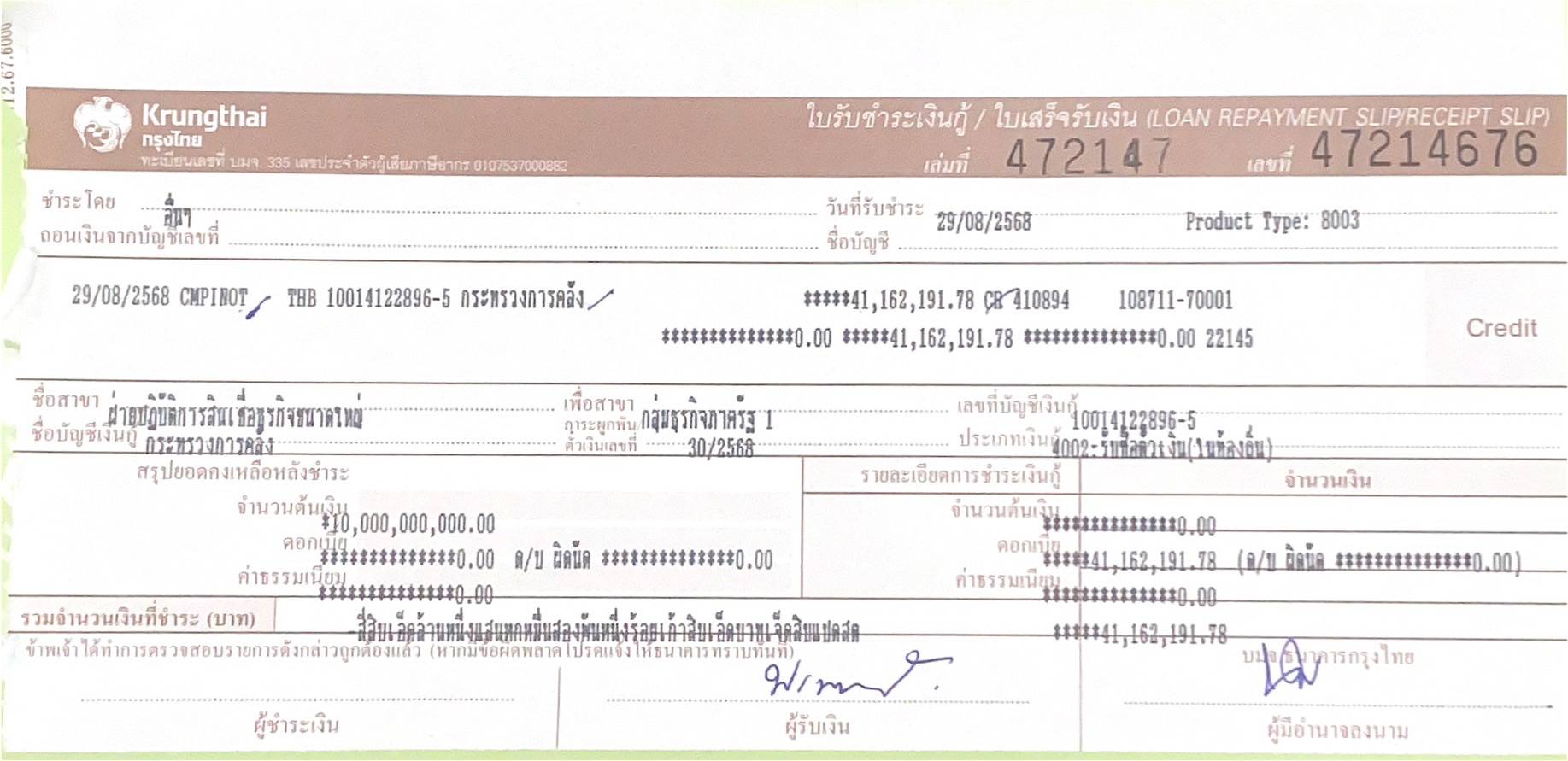 ธภร 1. 2419-2568 Billing แจ้ง สบน. Prepay PN 10,000 ลบ. (30_2568).pdf Slip ชำระต้นเงิน PN 10,000 ลบ. (4M) ชำระ 29-8-68.jpg Slip ชำระดอกเบี้ย PN 10,000 ลบ. (4M) ชำระ 29-8-68.jpg ตั๋วเลขที่ 30_2568 10,000 ลบ. (บันทึกหลังตั๋ว Prepay 29-8-68).pdf |